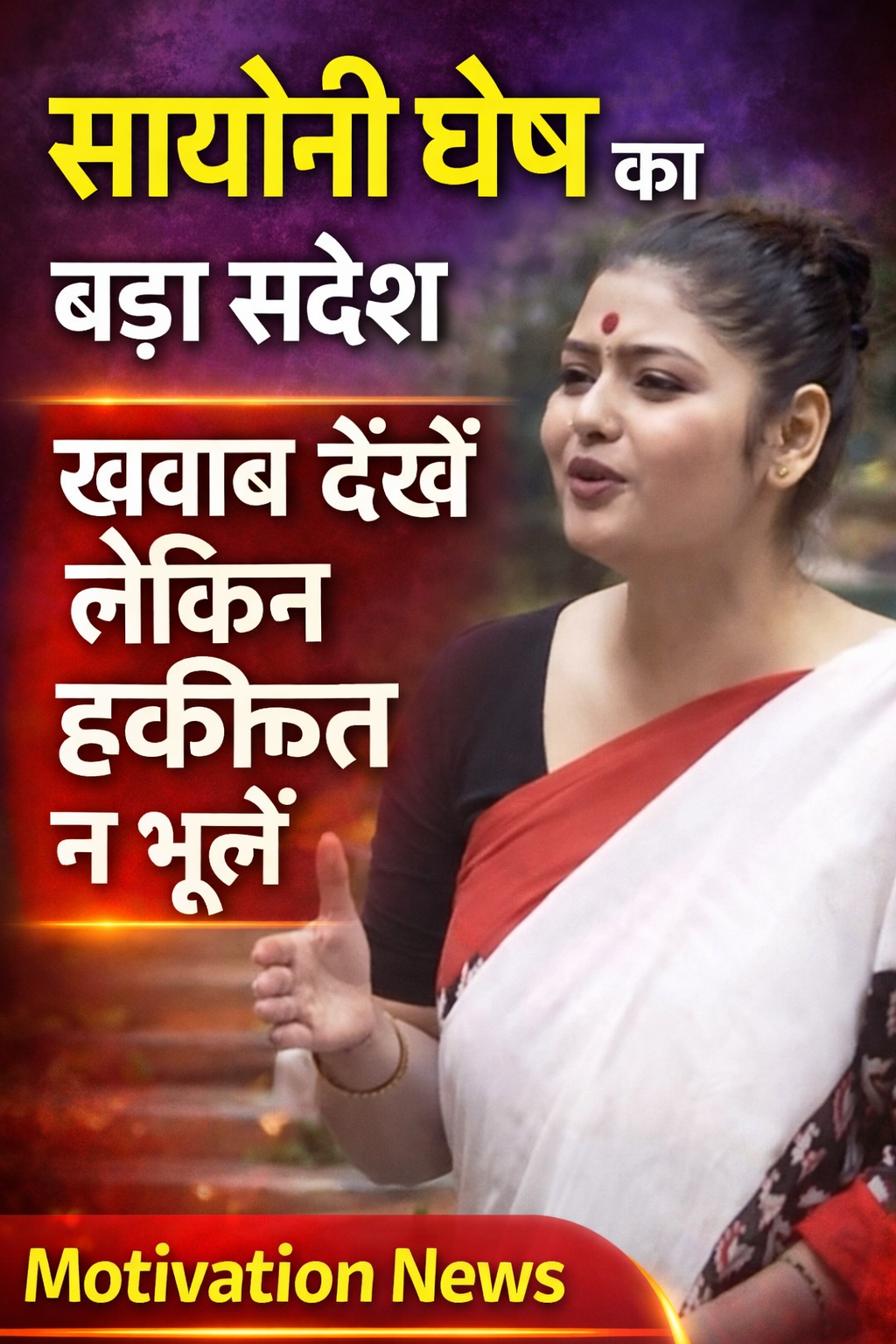सायोनी घोष ने अपने संदेश में यह भी स्पष्ट किया कि असली सफलता वही है, जो मेहनत, धैर्य और वास्तविकता के साथ हासिल की जाए। उन्होंने युवाओं से अपील की कि वे अपने सपनों को पूरा करने के लिए जमीन से जुड़े रहें और मजबूत नींव तैयार करें।